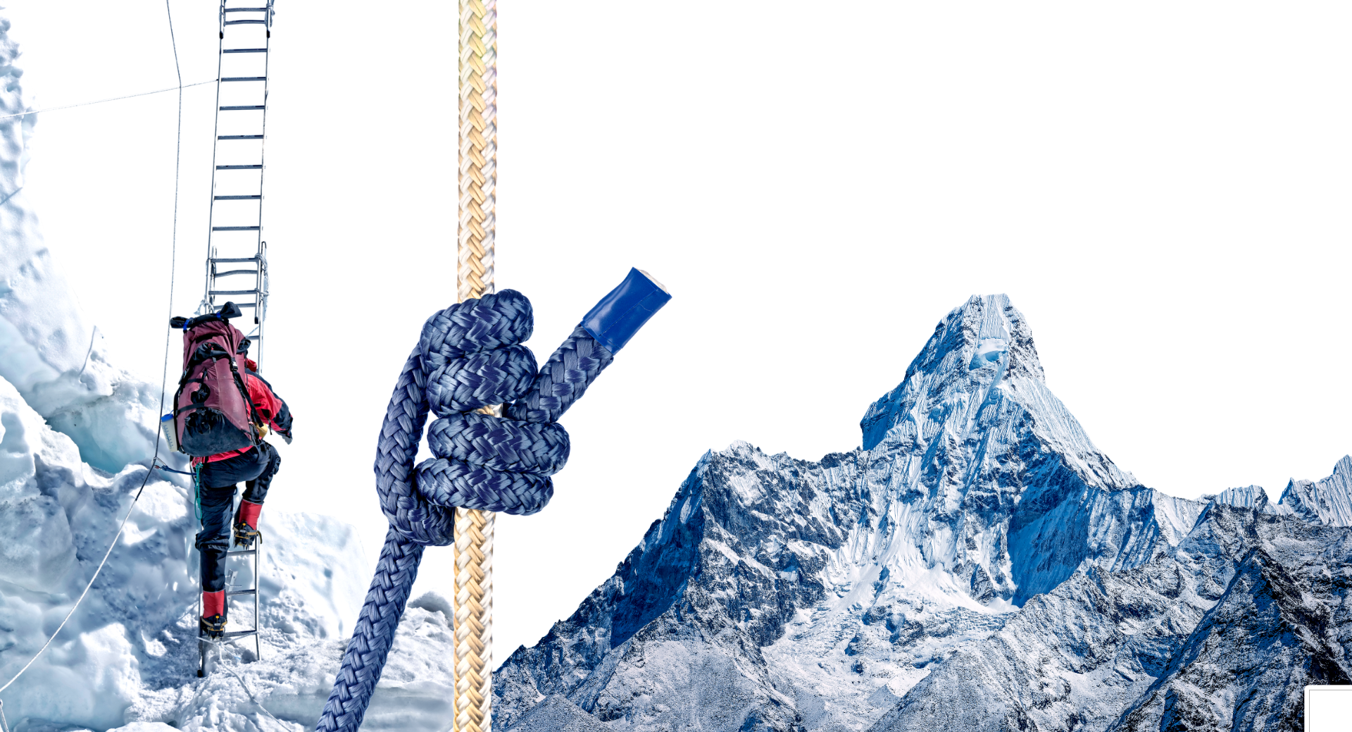 Cut-out mountaineering photography anchors the spreads in realism and gravitas. Climbers are shown mid-action — ascending ridgelines, crossing ice bridges, climbing ladders — reinforcing the idea that leadership is active, not static.